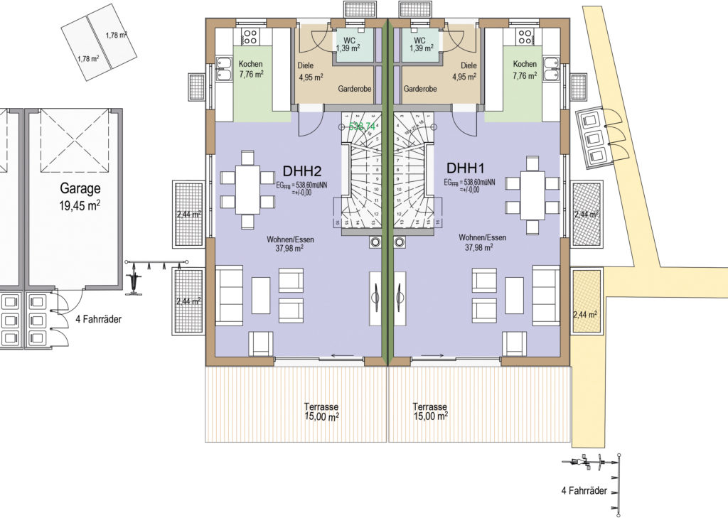 Bei dem Bauvorhaben handelt es sich um zwei modern designte Doppelhäuser mit eigenen Gärten und Terrassen in süd/süd-östlicher Ausrichtung. Drei Doppelhaushälften verfügen über eine eigene Garage und einen Freistellplatz, die erste Doppelhaushälfte hat zwei Freistellplätze.