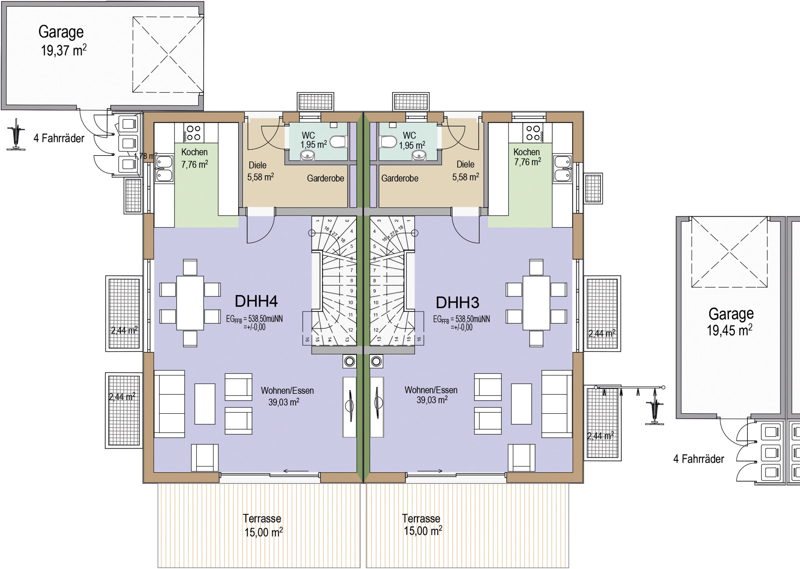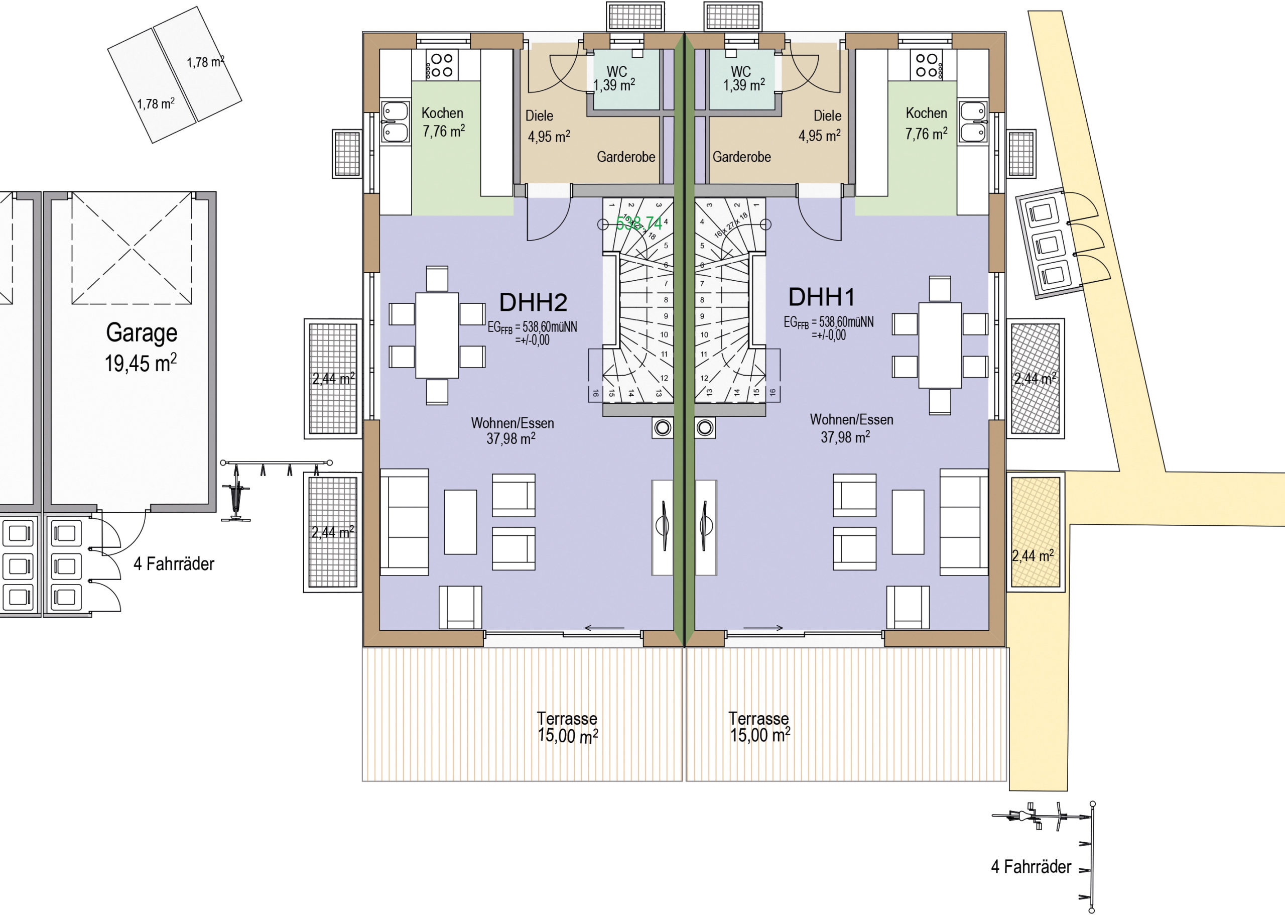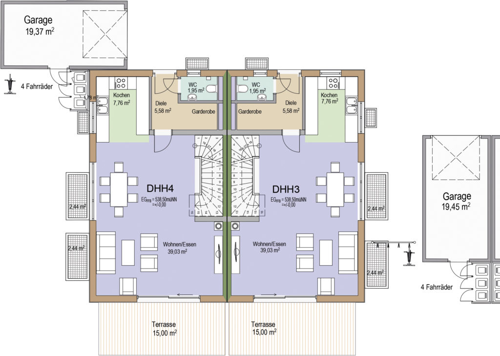 Auf insgesamt vier Etagen bieten die großzügigen Doppelhaushälften wohnfläche von ca. 169 m² bis ca 176 m² (ausgenommen Hobbyraum). Die real geteilten Grundstücke der einzelnen Doppelhaushälften variieren in Abhängigkeit der äußeren Grundstücksgrenzen zwischen ca. 215 m² und 249 m². Der Neubau wird in bewährter Massivbauweise errichtet. Das heißt die Geschossböden werden aus Stahlbeton gefertigt und die Wände werden als Ziegelmauerwerk direkt vor Ort errichtet. Optimierte Raumaufteilung und hohe Funktionalität in der alltäglichen Nutzung standen im Fokus bei der Planung der Grundrisse. Ziel war es behagliche Räume mit hohem Wohnwert zu schaffen.